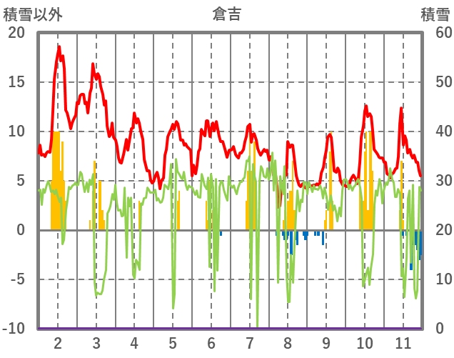 | 日 | 時 | 気温 | 降水 | 風向/風速 | 日照 | 積雪 | 降雪 |