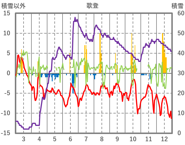 | 日 | 時 | 気温 | 降水 | 風向/風速 | 日照 | 積雪 | 降雪 |