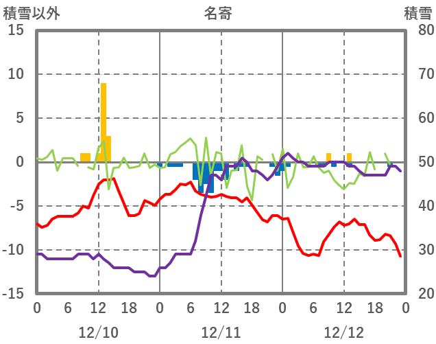 | 日 | 時 | 気温 | 降水 | 風向/風速 | 日照 | 積雪 | 降雪 |