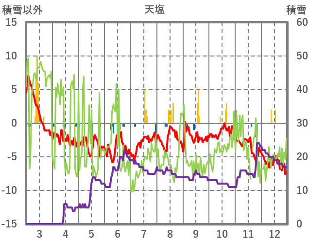 | 日 | 時 | 気温 | 降水 | 風向/風速 | 日照 | 積雪 | 降雪 |