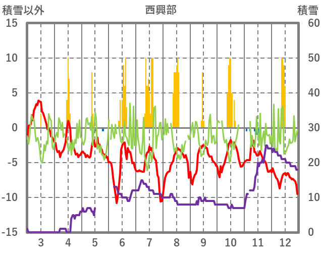 | 日 | 時 | 気温 | 降水 | 風向/風速 | 日照 | 積雪 | 降雪 |