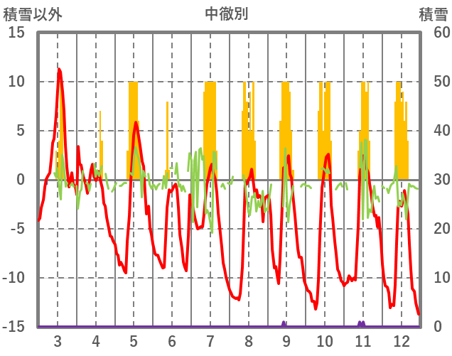 | 日 | 時 | 気温 | 降水 | 風向/風速 | 日照 | 積雪 | 降雪 |