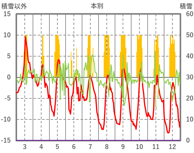 | 日 | 時 | 気温 | 降水 | 風向/風速 | 日照 | 積雪 | 降雪 |