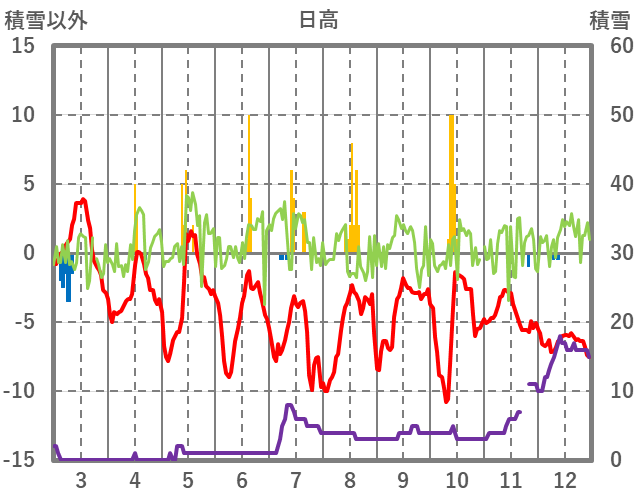 | 日 | 時 | 気温 | 降水 | 風向/風速 | 日照 | 積雪 | 降雪 |