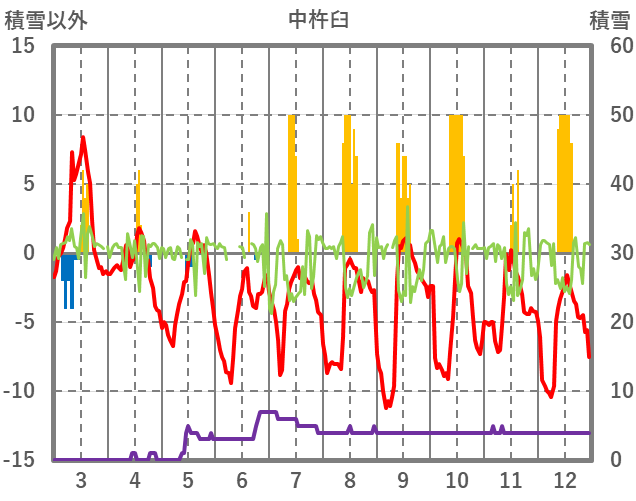 | 日 | 時 | 気温 | 降水 | 風向/風速 | 日照 | 積雪 | 降雪 |
