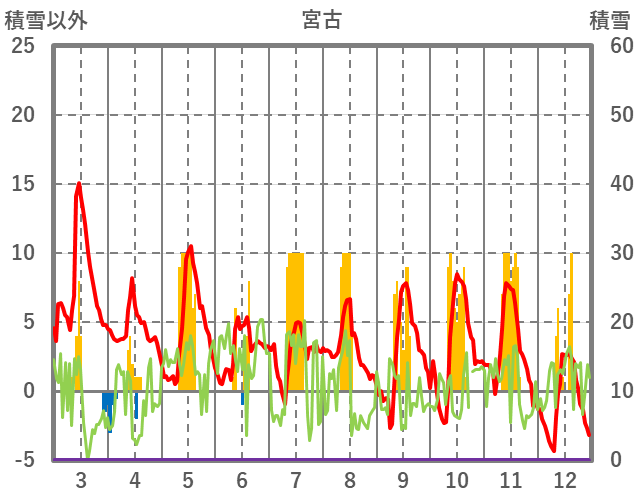| 日 | 時 | 気温 | 降水 | 風向/風速 | 日照 | 積雪 | 降雪 |
