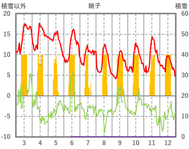 | 日 | 時 | 気温 | 降水 | 風向/風速 | 日照 | 積雪 | 降雪 |
