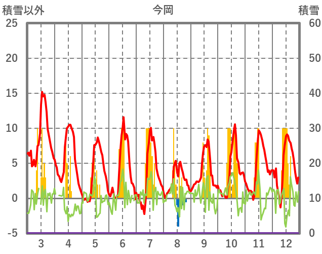 | 日 | 時 | 気温 | 降水 | 風向/風速 | 日照 | 積雪 | 降雪 |