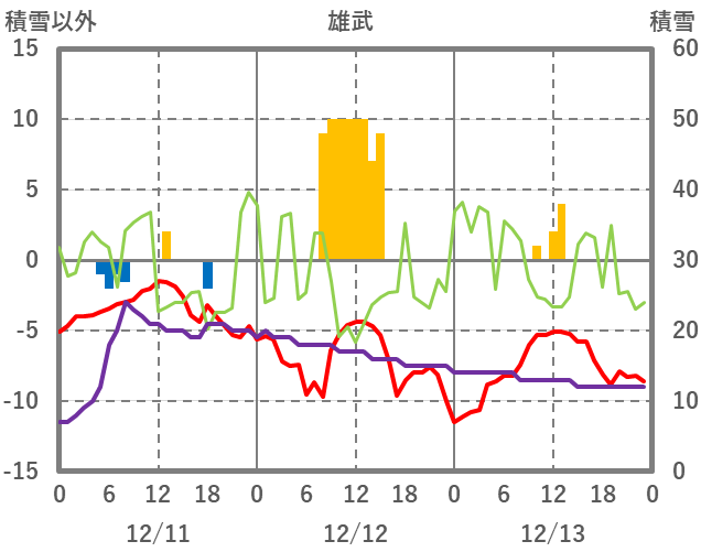 | 日 | 時 | 気温 | 降水 | 風向/風速 | 日照 | 積雪 | 降雪 |