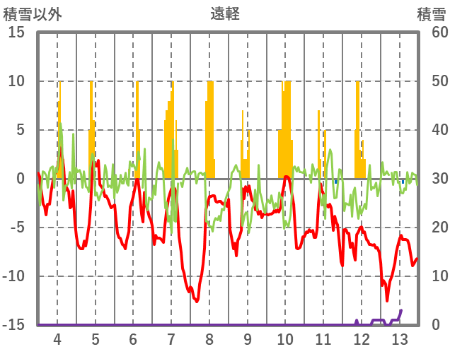 | 日 | 時 | 気温 | 降水 | 風向/風速 | 日照 | 積雪 | 降雪 |