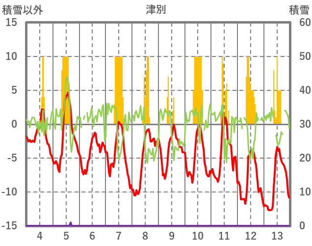 | 日 | 時 | 気温 | 降水 | 風向/風速 | 日照 | 積雪 | 降雪 |