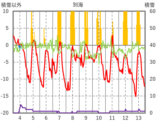 | 日 | 時 | 気温 | 降水 | 風向/風速 | 日照 | 積雪 | 降雪 |
