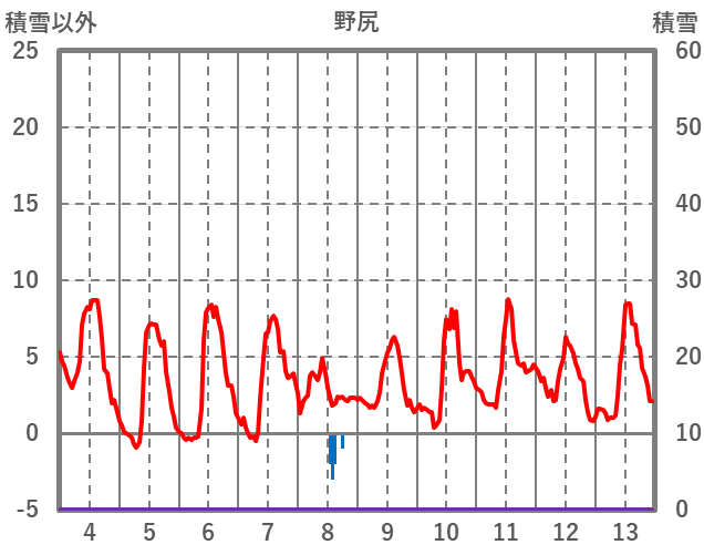 | 日 | 時 | 気温 | 降水 | 風向/風速 | 日照 | 積雪 | 降雪 |