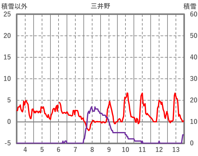 | 日 | 時 | 気温 | 降水 | 風向/風速 | 日照 | 積雪 | 降雪 |