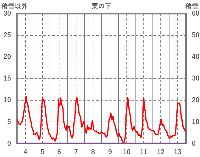 | 日 | 時 | 気温 | 降水 | 風向/風速 | 日照 | 積雪 | 降雪 |