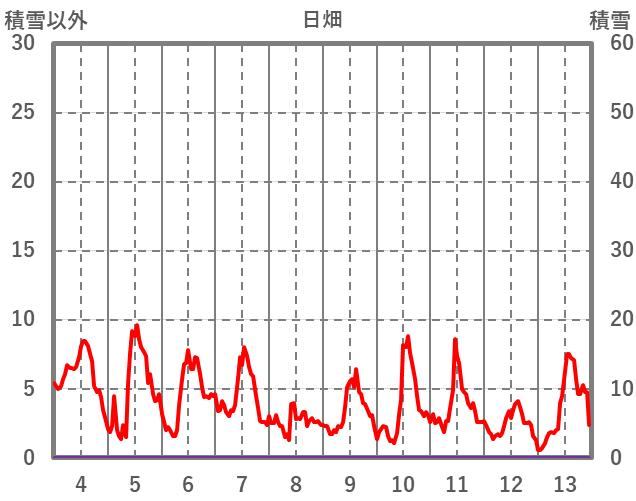 | 日 | 時 | 気温 | 降水 | 風向/風速 | 日照 | 積雪 | 降雪 |