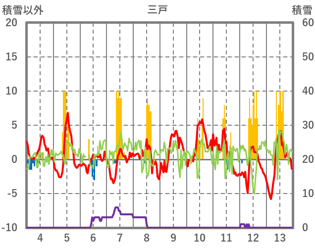 | 日 | 時 | 気温 | 降水 | 風向/風速 | 日照 | 積雪 | 降雪 |
