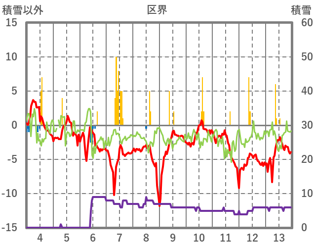 | 日 | 時 | 気温 | 降水 | 風向/風速 | 日照 | 積雪 | 降雪 |