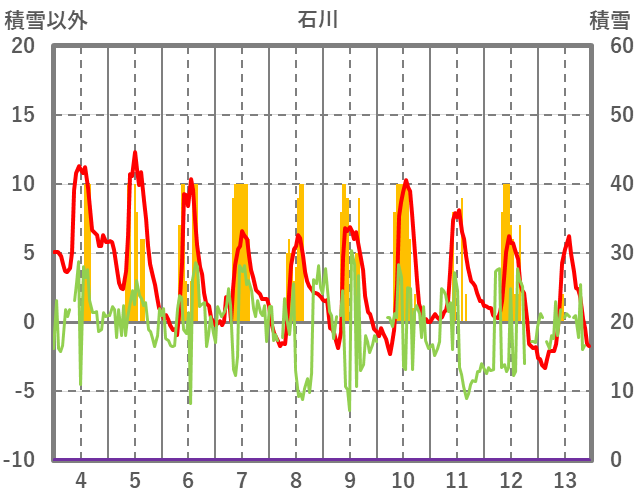 | 日 | 時 | 気温 | 降水 | 風向/風速 | 日照 | 積雪 | 降雪 |
