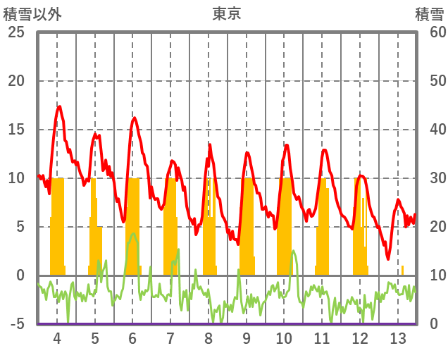 | 日 | 時 | 気温 | 降水 | 風向/風速 | 日照 | 積雪 | 降雪 |