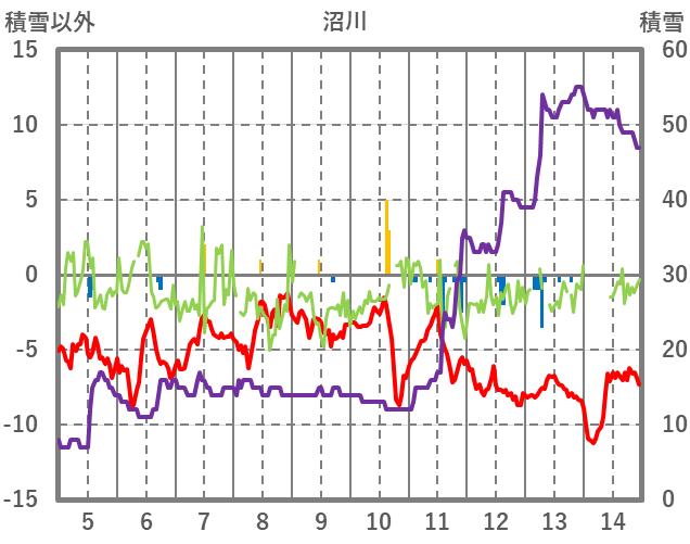 | 日 | 時 | 気温 | 降水 | 風向/風速 | 日照 | 積雪 | 降雪 |
