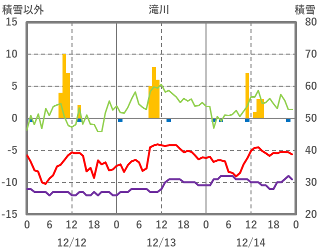 | 日 | 時 | 気温 | 降水 | 風向/風速 | 日照 | 積雪 | 降雪 |