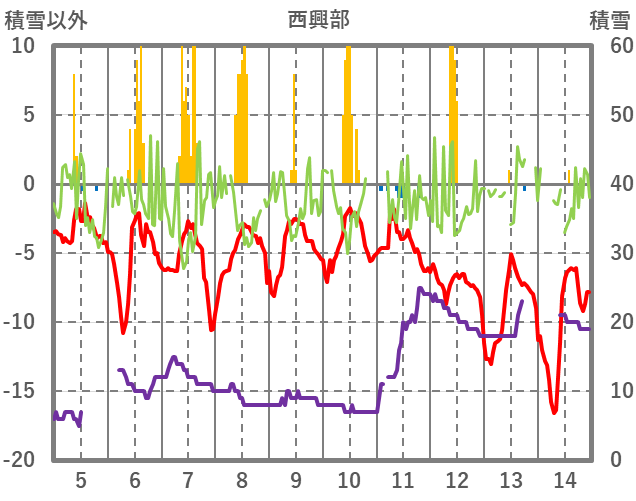 | 日 | 時 | 気温 | 降水 | 風向/風速 | 日照 | 積雪 | 降雪 |