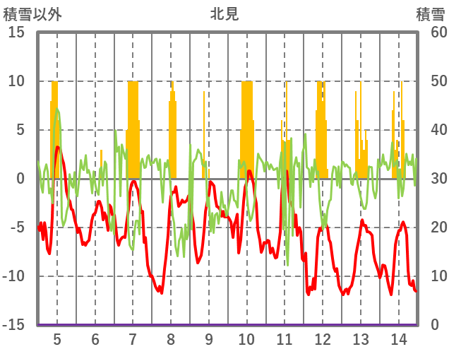 | 日 | 時 | 気温 | 降水 | 風向/風速 | 日照 | 積雪 | 降雪 |