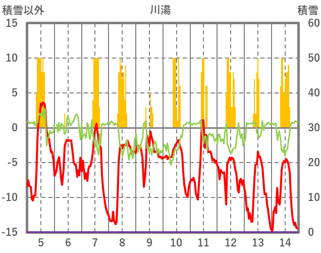 | 日 | 時 | 気温 | 降水 | 風向/風速 | 日照 | 積雪 | 降雪 |