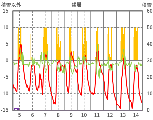 | 日 | 時 | 気温 | 降水 | 風向/風速 | 日照 | 積雪 | 降雪 |