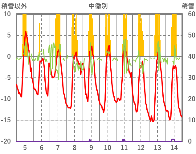 | 日 | 時 | 気温 | 降水 | 風向/風速 | 日照 | 積雪 | 降雪 |