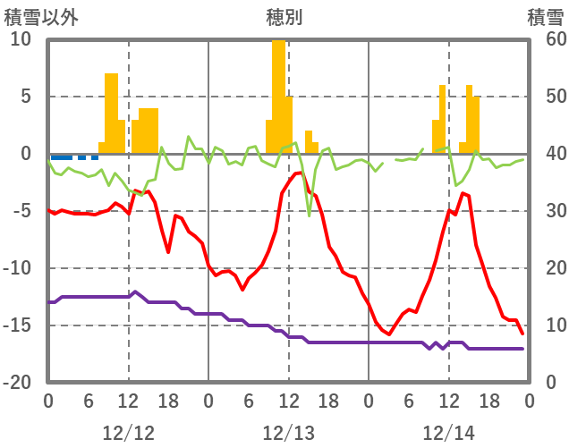 | 日 | 時 | 気温 | 降水 | 風向/風速 | 日照 | 積雪 | 降雪 |