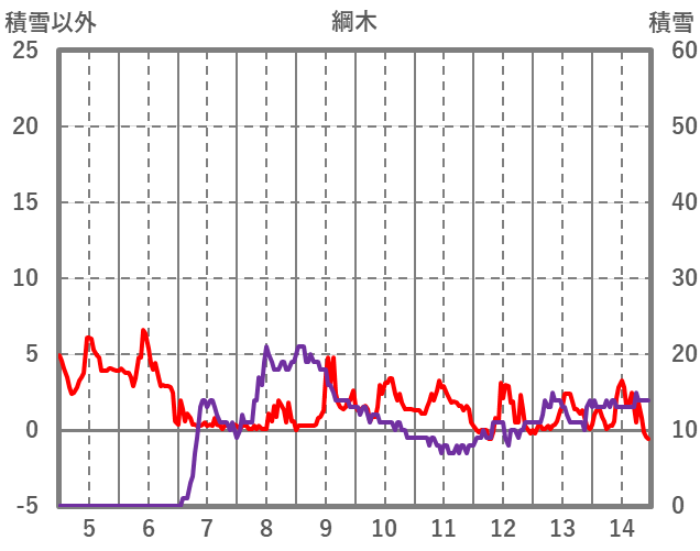 | 日 | 時 | 気温 | 降水 | 風向/風速 | 日照 | 積雪 | 降雪 |