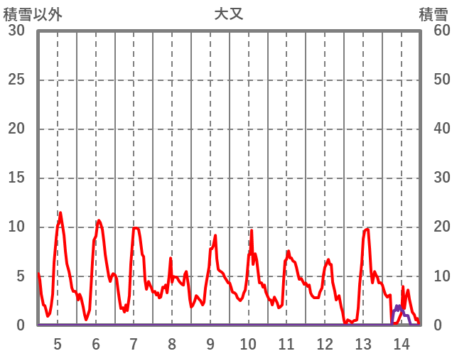 | 日 | 時 | 気温 | 降水 | 風向/風速 | 日照 | 積雪 | 降雪 |