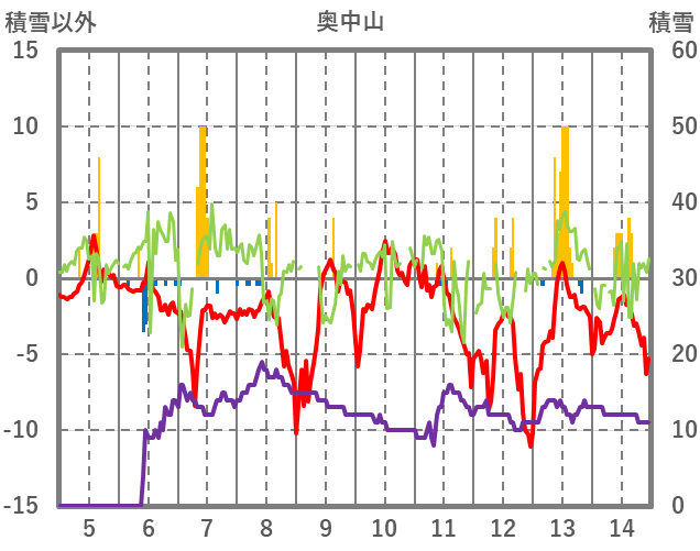 | 日 | 時 | 気温 | 降水 | 風向/風速 | 日照 | 積雪 | 降雪 |