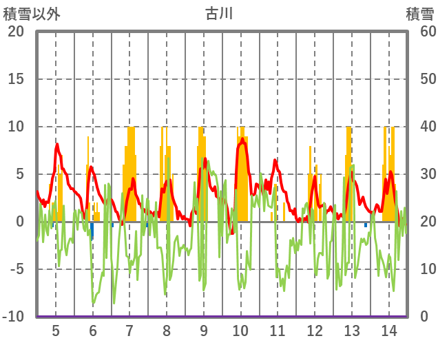 | 日 | 時 | 気温 | 降水 | 風向/風速 | 日照 | 積雪 | 降雪 |
