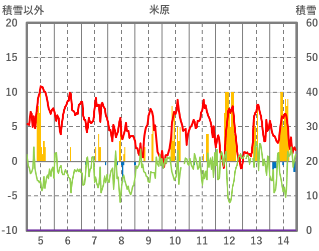 | 日 | 時 | 気温 | 降水 | 風向/風速 | 日照 | 積雪 | 降雪 |