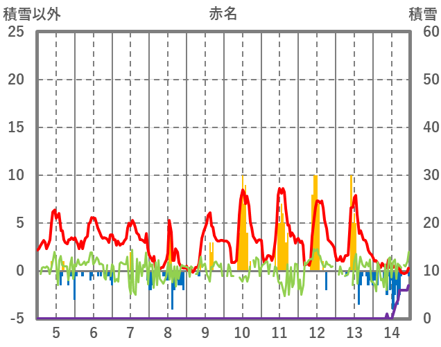 | 日 | 時 | 気温 | 降水 | 風向/風速 | 日照 | 積雪 | 降雪 |