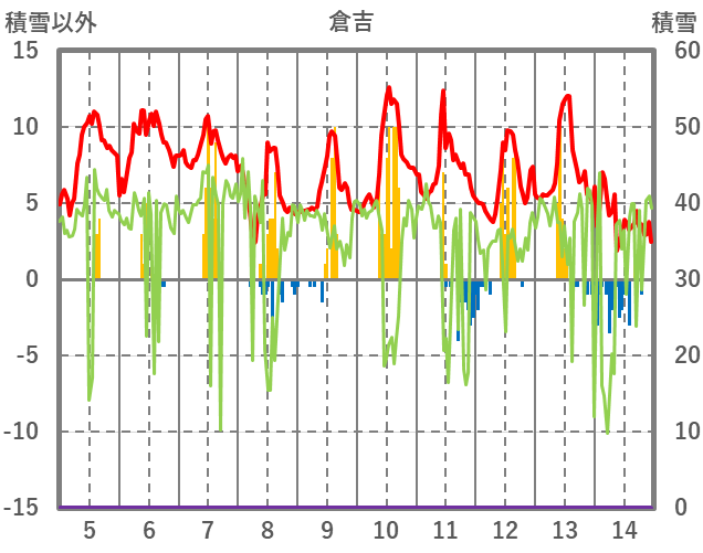 | 日 | 時 | 気温 | 降水 | 風向/風速 | 日照 | 積雪 | 降雪 |
