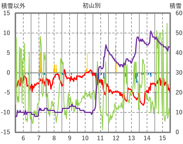 | 日 | 時 | 気温 | 降水 | 風向/風速 | 日照 | 積雪 | 降雪 |