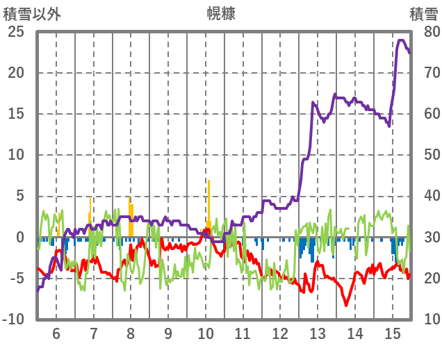 | 日 | 時 | 気温 | 降水 | 風向/風速 | 日照 | 積雪 | 降雪 |