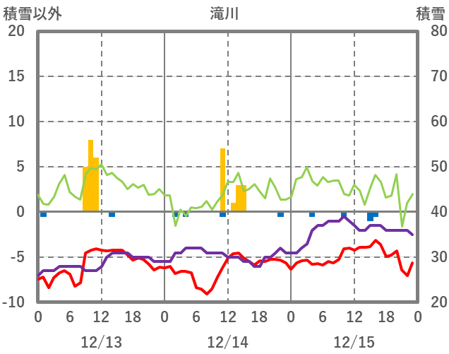 | 日 | 時 | 気温 | 降水 | 風向/風速 | 日照 | 積雪 | 降雪 |