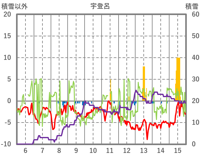 | 日 | 時 | 気温 | 降水 | 風向/風速 | 日照 | 積雪 | 降雪 |