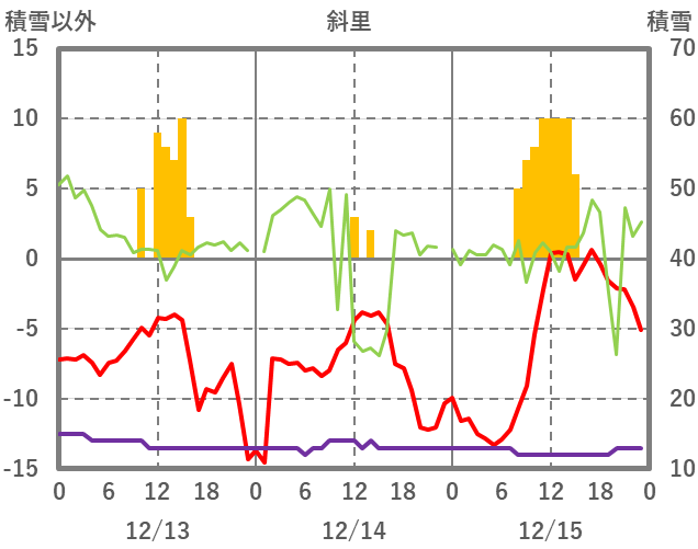 | 日 | 時 | 気温 | 降水 | 風向/風速 | 日照 | 積雪 | 降雪 |