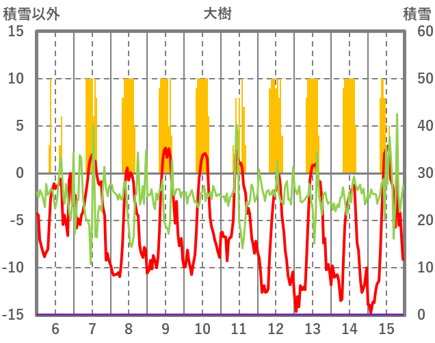 | 日 | 時 | 気温 | 降水 | 風向/風速 | 日照 | 積雪 | 降雪 |