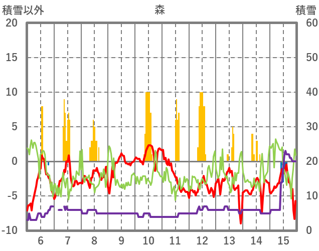 | 日 | 時 | 気温 | 降水 | 風向/風速 | 日照 | 積雪 | 降雪 |