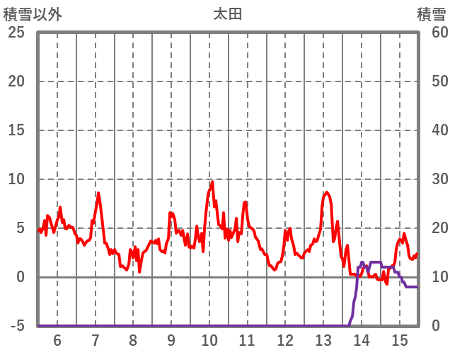 | 日 | 時 | 気温 | 降水 | 風向/風速 | 日照 | 積雪 | 降雪 |