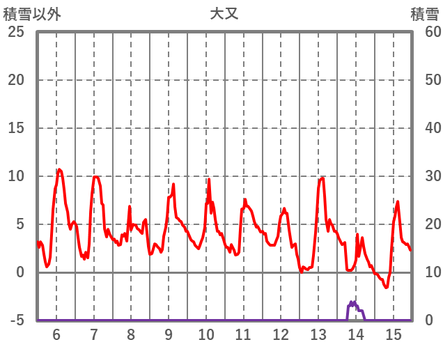 | 日 | 時 | 気温 | 降水 | 風向/風速 | 日照 | 積雪 | 降雪 |