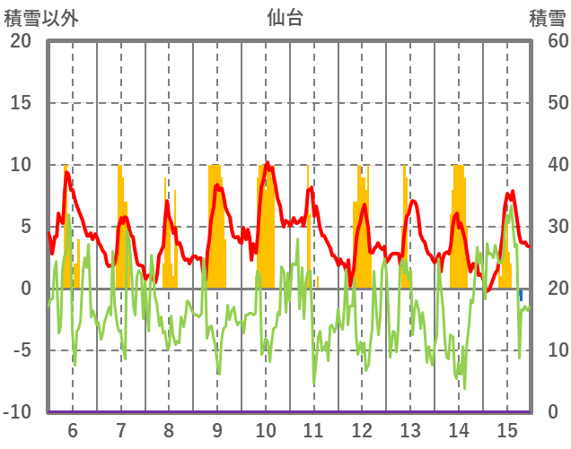 | 日 | 時 | 気温 | 降水 | 風向/風速 | 日照 | 積雪 | 降雪 |