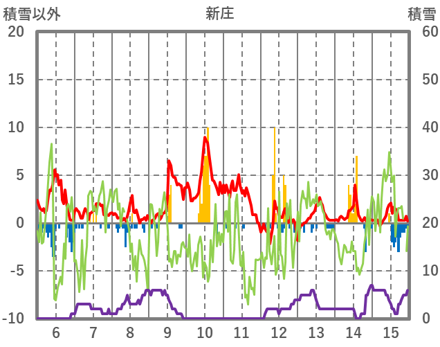 | 日 | 時 | 気温 | 降水 | 風向/風速 | 日照 | 積雪 | 降雪 |